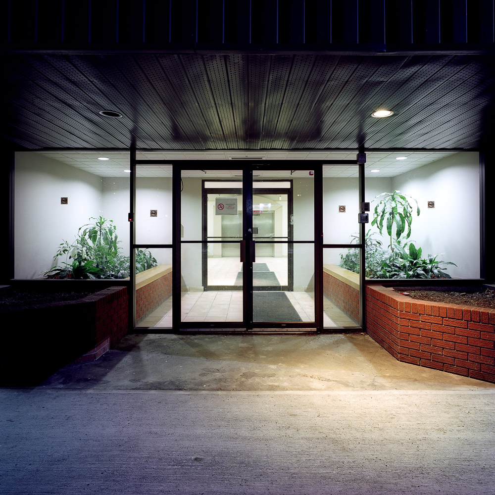 The illuminated interiors serve to enhance security by simulating presence, but this simulation is obvious and transparent, as it is the illumination itself that reveals the unpopulated interiors as visibly deserted.